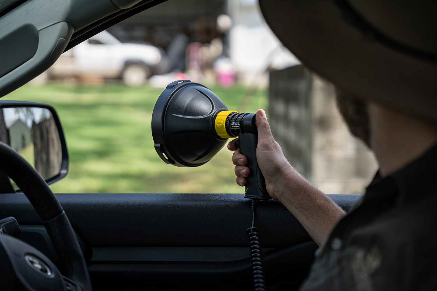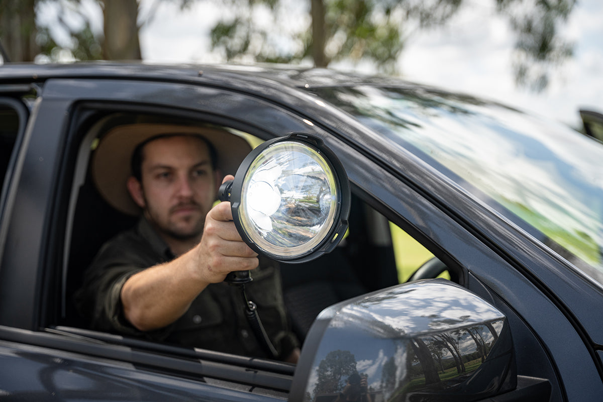 Powered via a 12V cigarette lighter plug with a generous 3-metre lead, this spotlight is ideally suited for use from vehicles, utes, and ATVs. A high-visibility rubber identifier ring makes it easy to locate in low light when set down.